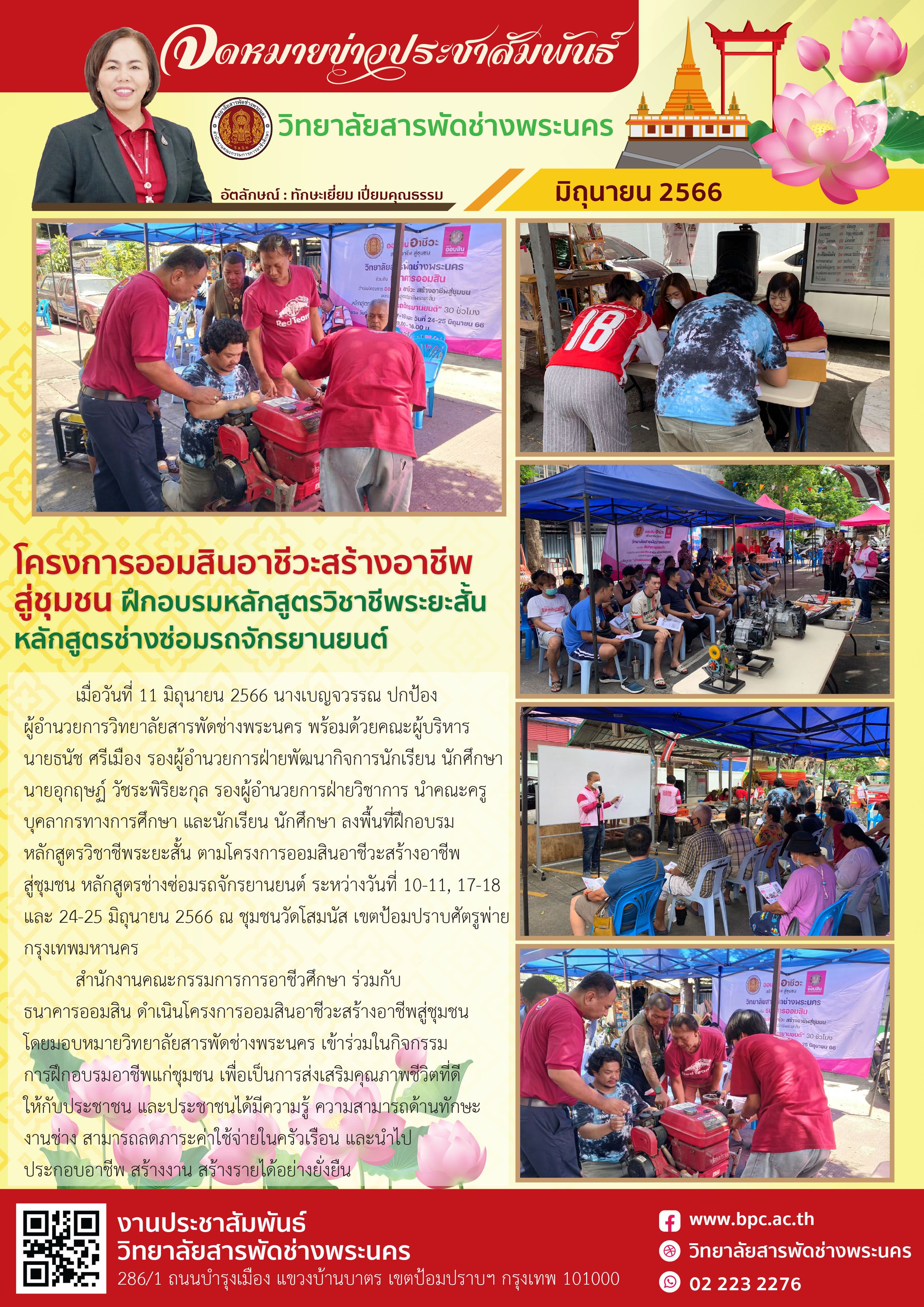 เมื่อวันที่ 11 มิถุนายน 2566 นางเบญจวรรณ ปกป้อง ผู้อำนวยการวิทยาลัยสารพัดช่างพระนคร พร้อมด้วยคณะผู้บริหาร นายธนัช ศรีเมือง รองผู้อำนวยการฝ่ายพัฒนากิจการนักเรียน นักศึกษา นายอุกฤษฏ์ วัชระพิริยะกุล รองผู้อำนวยการฝ่ายวิชาการ นำคณะครู บุคลากรทางการศึกษา และนักเรียน นักศึกษา ลงพื้นที่ฝึกอบรมหลักสูตรวิชาชีพระยะสั้น ตามโครงการออมสินอาชีวะสร้างอาชีพสู่ชุมชน หลักสูตรช่างซ่อมรถจักรยานยนต์ ระหว่างวันที่ 10-11, 17-18 และ 24-25 มิถุนายน 2566 ณ ชุมชนวัดโสมนัส เขตป้อมปราบศัตรูพ่าย กรุงเทพมหานคร